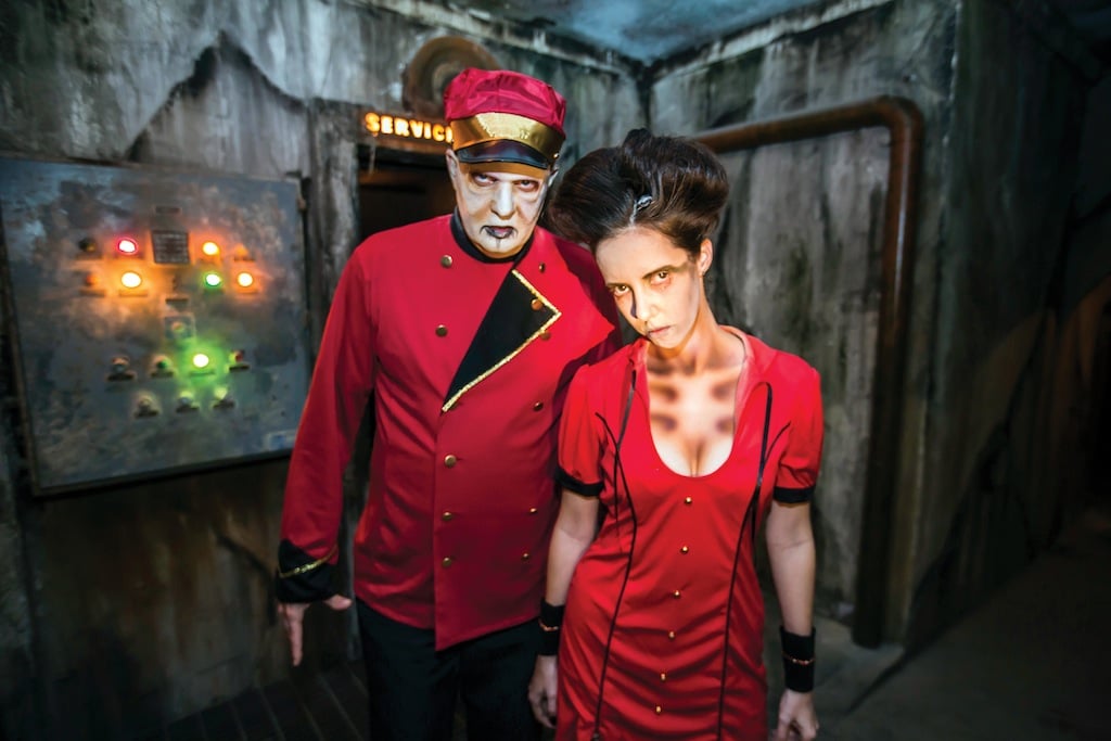 - 13th Gate Bellhops Scott Shavers, left, and Sarah Bass observe guest in the waiting area of the haunted house before gates open for a night of terrifing enjoyment.