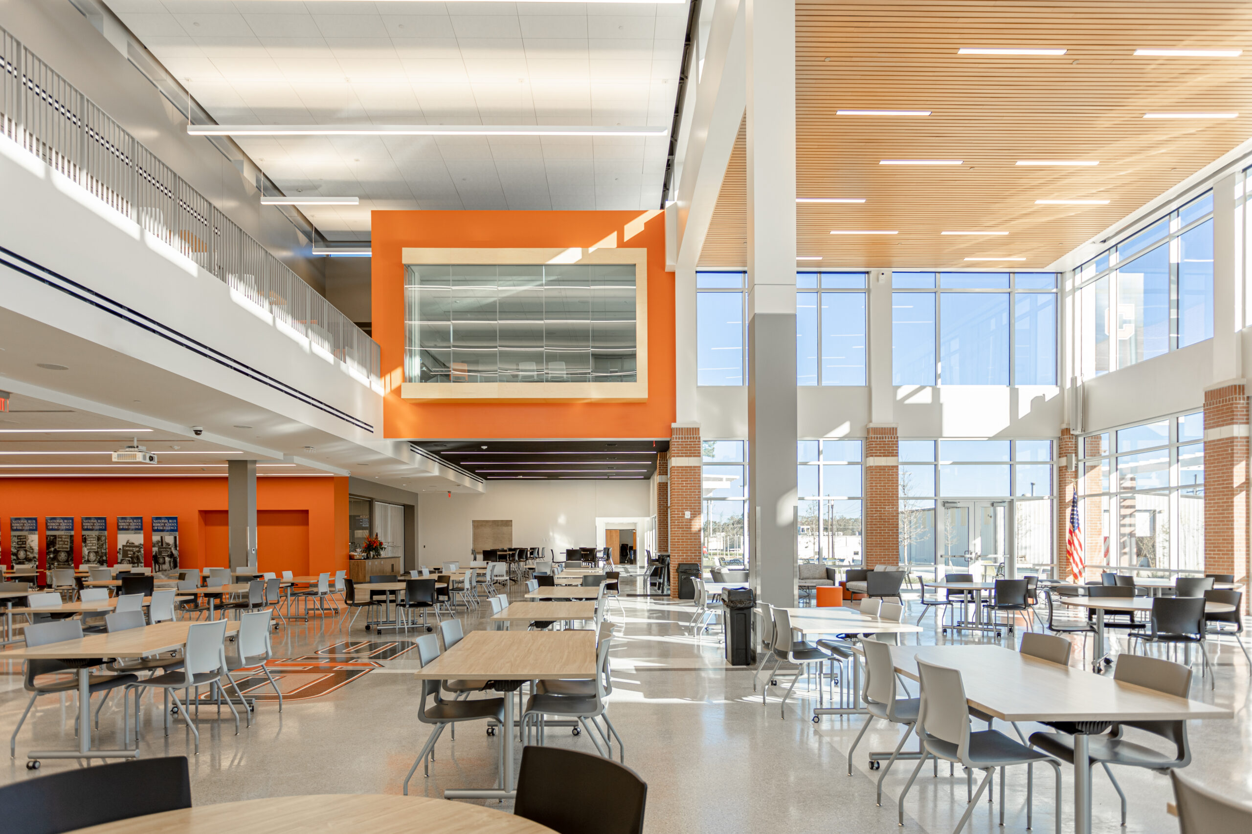 The dining area favors small arrangements rather than the long tables often seen in cafeterias; after hours, the school’s many clubs and organizations use the room for enrichment, benefitting from acoustic performance and large video screens concealed in the upper ceiling. Tables are easily cleared for community events. With room for over 1,000 people, banquets and award ceremonies no longer need to take place offsite.