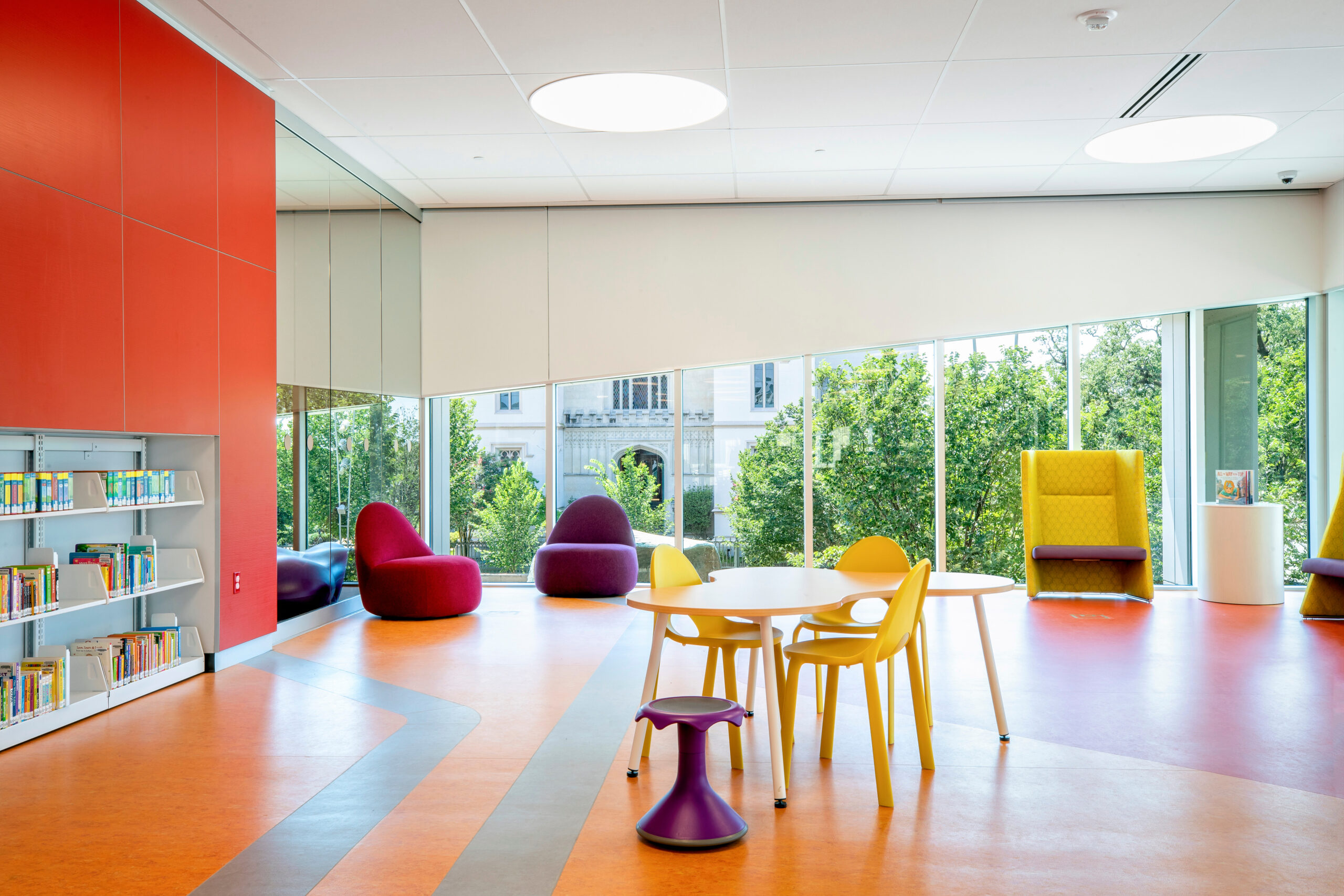 The Children’s Room is tucked under the overhang and occupies the entire second floor, providing a safe environment for children and their caregivers. Unlike the other floors, this floor has a relatively modest ceiling height with windows scaled to little learners. The floor also features a dedicated space for story hour and other programs.