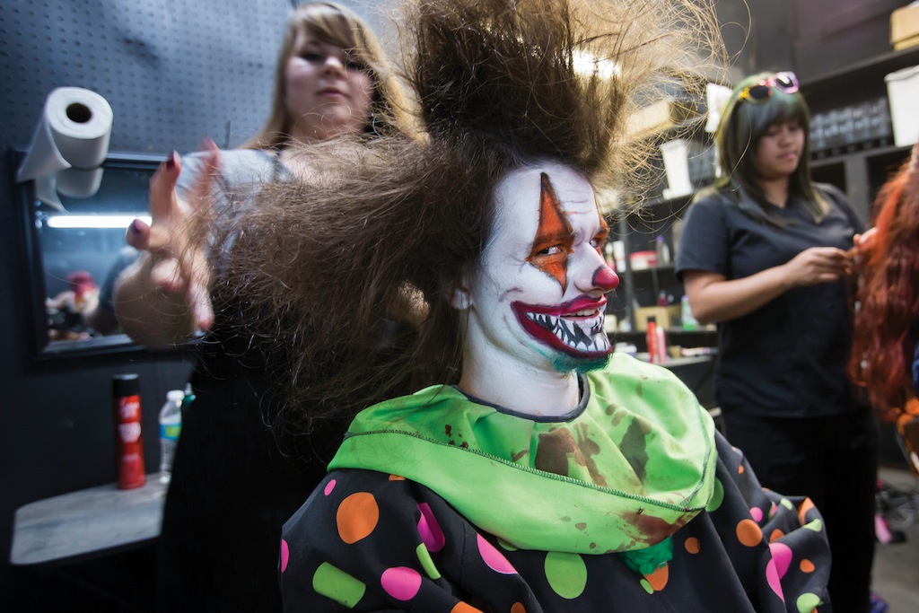 - Mirror Maze clown Michael McCarstle gets his hair done by stylist Blair Padgett. During the Halloween season, over 100 professional actors, 12 special effects makeup and airbrush artists and several costume specialist help produce one of the top rated haunted houses in the country.
