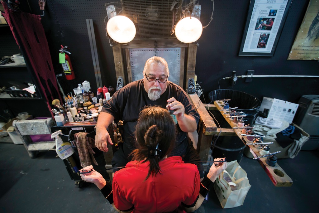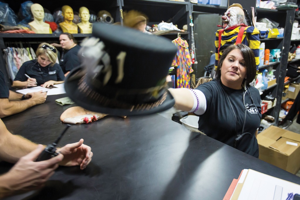 - In the costume room Christi Ferrell passes a top hat to one of the performers. During the Halloween season, over 100 professional actors, 12 special effects makeup and airbrush artists and several costume specialist help produce one of the top rated haunted houses in the country.