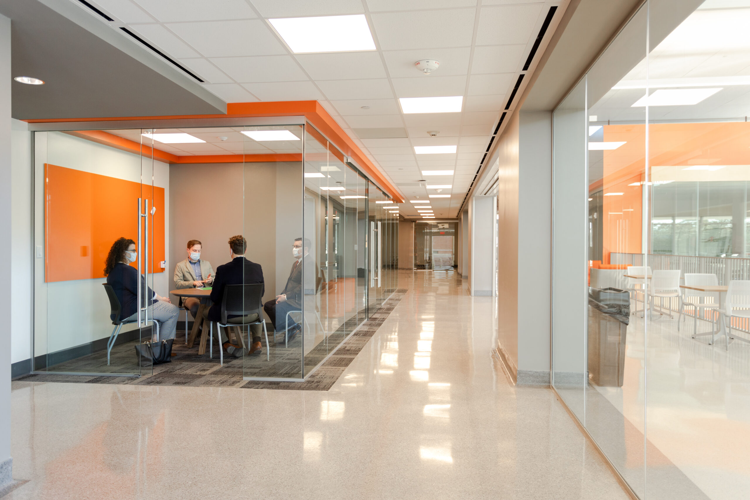 Collaborative spaces, with glass walls for maximum visibility with minimum intrusion, are open to faculty and students alike. Insulated glass room allows the large specialty classroom to overlook the dining space.