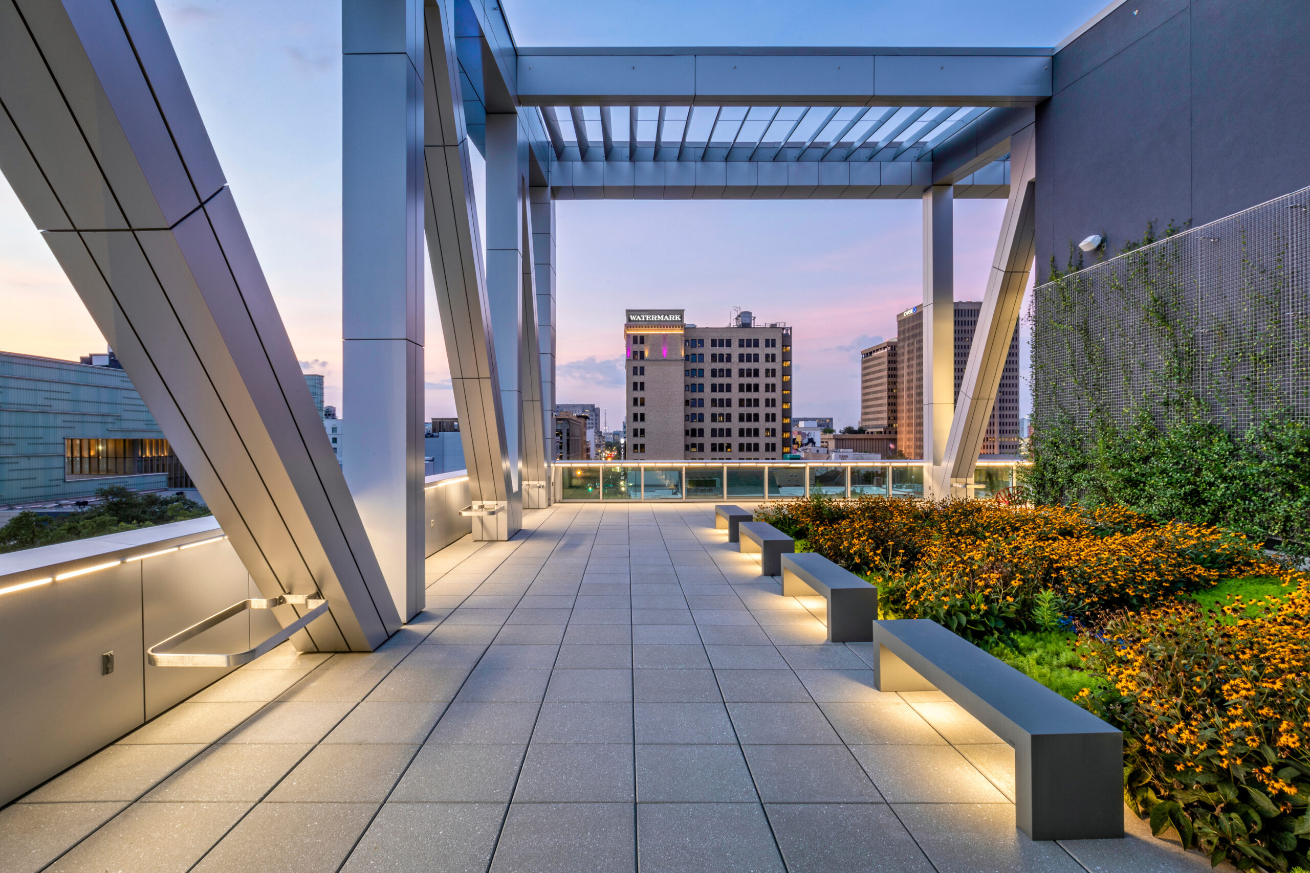 The roof terrace is one of the few publicly accessible outdoor spaces in the City with views of the Mississippi over the levee. It supports a wide variety of public and non-profit programs and events, reconnecting the community to the river.