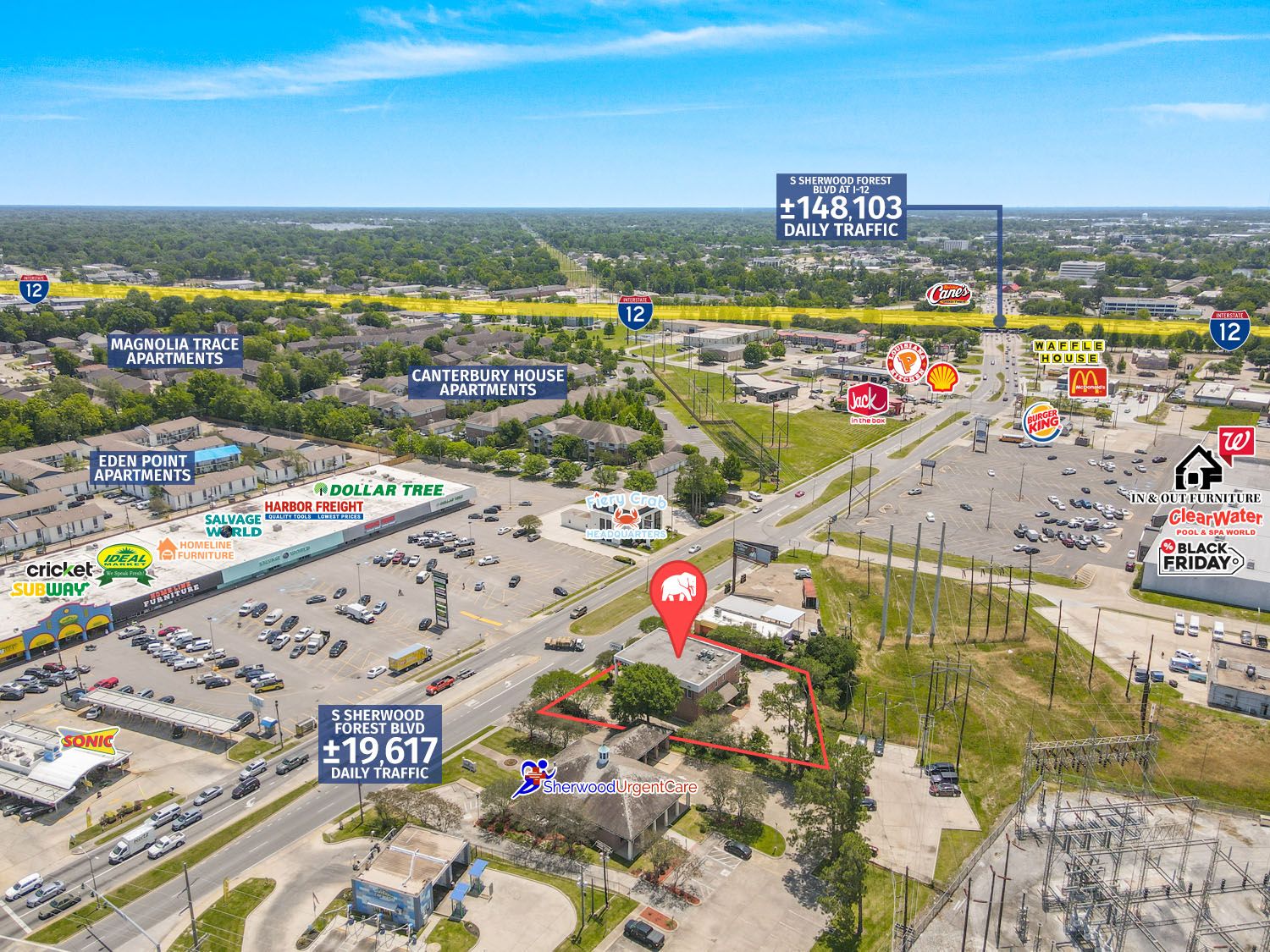 Currently operating as BRECO Federal Credit Union’s headquarters, 1850 S. Sherwood Forest Blvd. is the ideal opportunity for corporate and financial institution users. The property features a highly visible standalone building with approximately ±19,617 daily traffic, and ±5,500 square feet of 2-story office and retail space. The first floor includes a large open lobby, a bank teller area, and perimeter offices, while the second floor features a conference room and executive-style offices. The property is strategically positioned on S. Sherwood Forest between I-12 and Old Hammond Hwy. Call Will Chadwick at 800.895.9329. Click here to view listing.