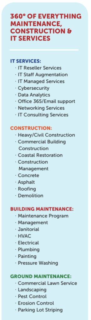 - Construction: Heavy civil and commercial construction, coastal restoration, concrete, asphalt, roofing, and demolition.