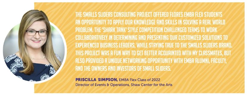 In March 2021, Baton Rouge-based company Smalls Sliders partnered with the students in LSU’s Flores Executive MBA Flex Program to host a business challenge event. This virtual competition gave students a chance to work on a short-term consulting project and present results to the partner company.