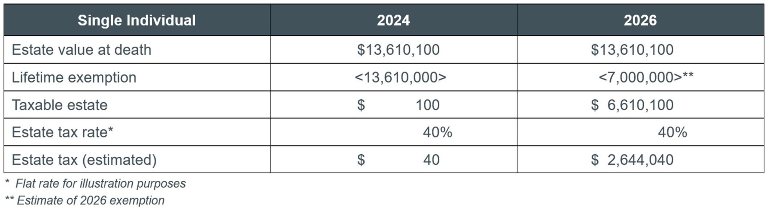 The exemption eliminates federal estate taxes on amounts up to the threshold of $13,610,000 (currently) either (1) gifted to family members during your lifetime or (2) bequeathed to someone upon your death. An easier way to think of the estate tax exemption is this: if a person dies in 2024 and has an estate valued at $13,610,100 and has not made any taxable gifts during lifetime, their estate will only owe tax on $100. If a person dies in 2026 and has an estate valued at $13,610,100 and has not made any taxable gifts during lifetime, their estate will owe tax on approximately $6,610,100.