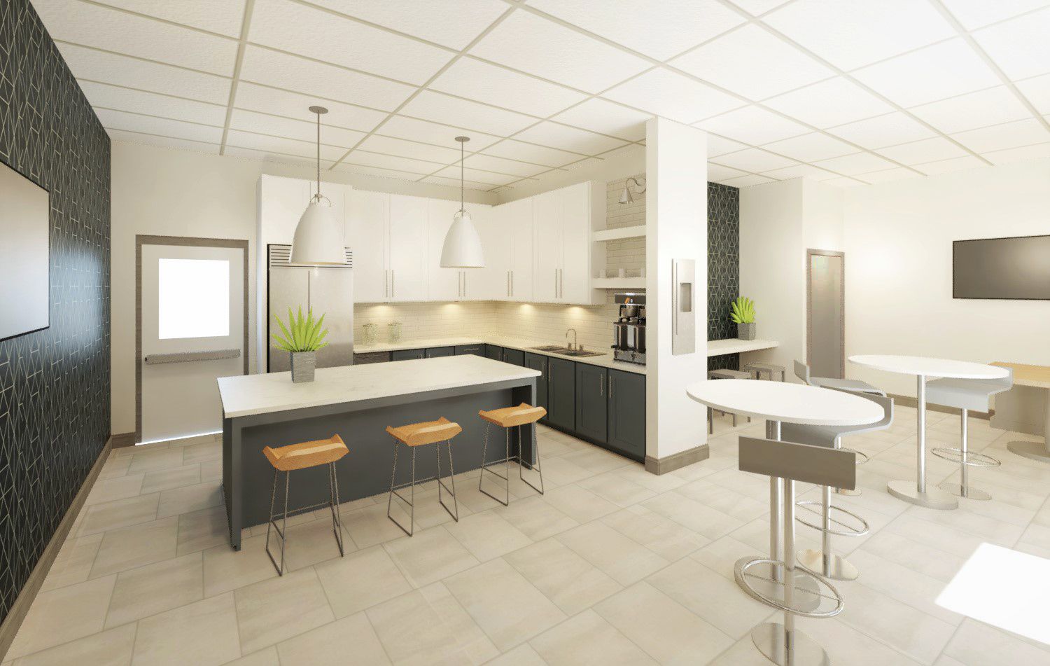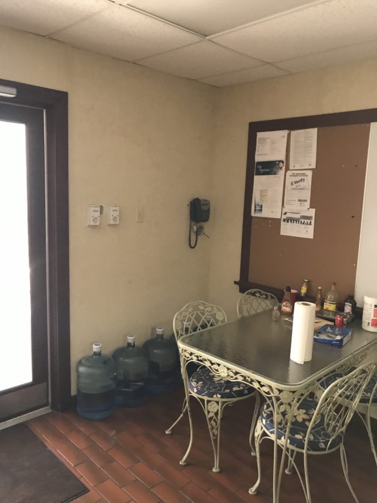 —Low drop-tile ceilings made the already small break area even more confining. Employees are more productive when they have an appropriate space to pause.