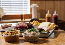Scene: Oak-smoked barbecue prepared in offset smokers and served with detailed sides like corn elote and...