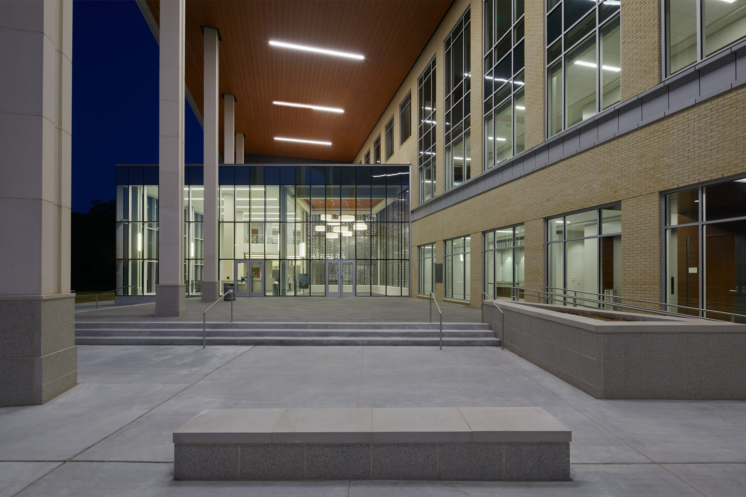 The courthouse’s exterior material palate mimics its neighboring municipal building with the intent of creating a visual campus.