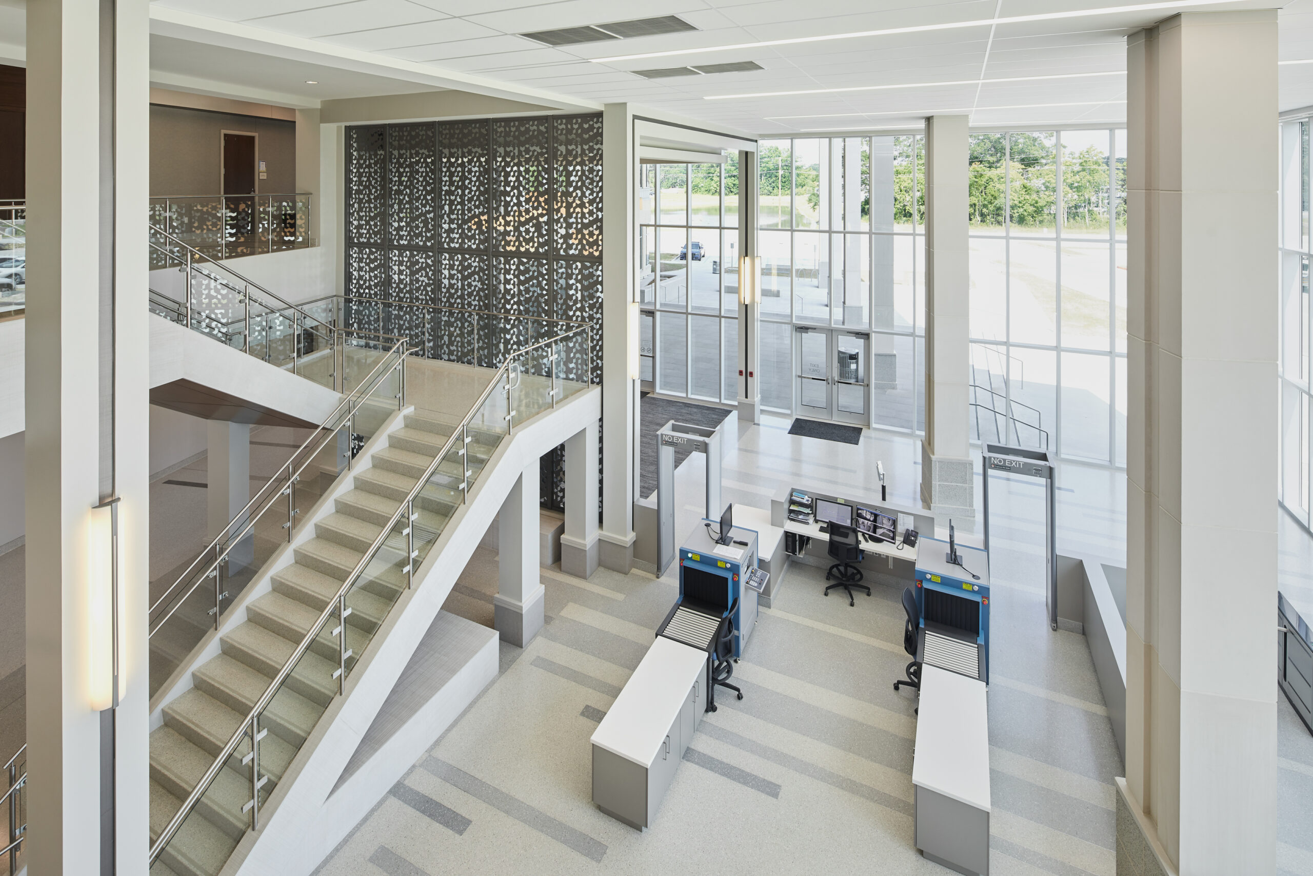 While broad expanses of glass are used along the exterior to draw natural light into the building, glass used strategically throughout the interior gives staff added security and prevents the passage of contraband to those in custody. In particular, a patterned glass screen wall along inmate movement routes offer texture and visual interest to the space.