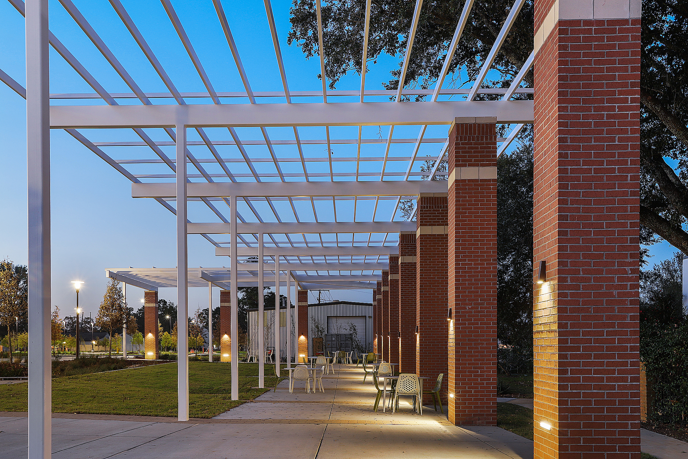The pavilion offers students ample outdoor seating for dining or informal gatherings. It also serves as an outdoor feature for evening events held in the Student Center. Native and adapted species add textural interest and shade and aid in water conservation after establishment. Large planting islands in the adjacent parking area mitigate heat.