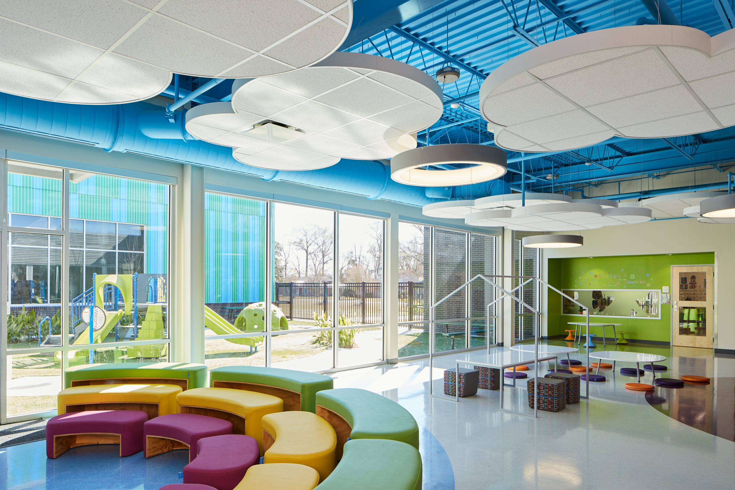 - The exterior colors, while playful and engaging for the kids, also serve as a way-finding tool around the campus.