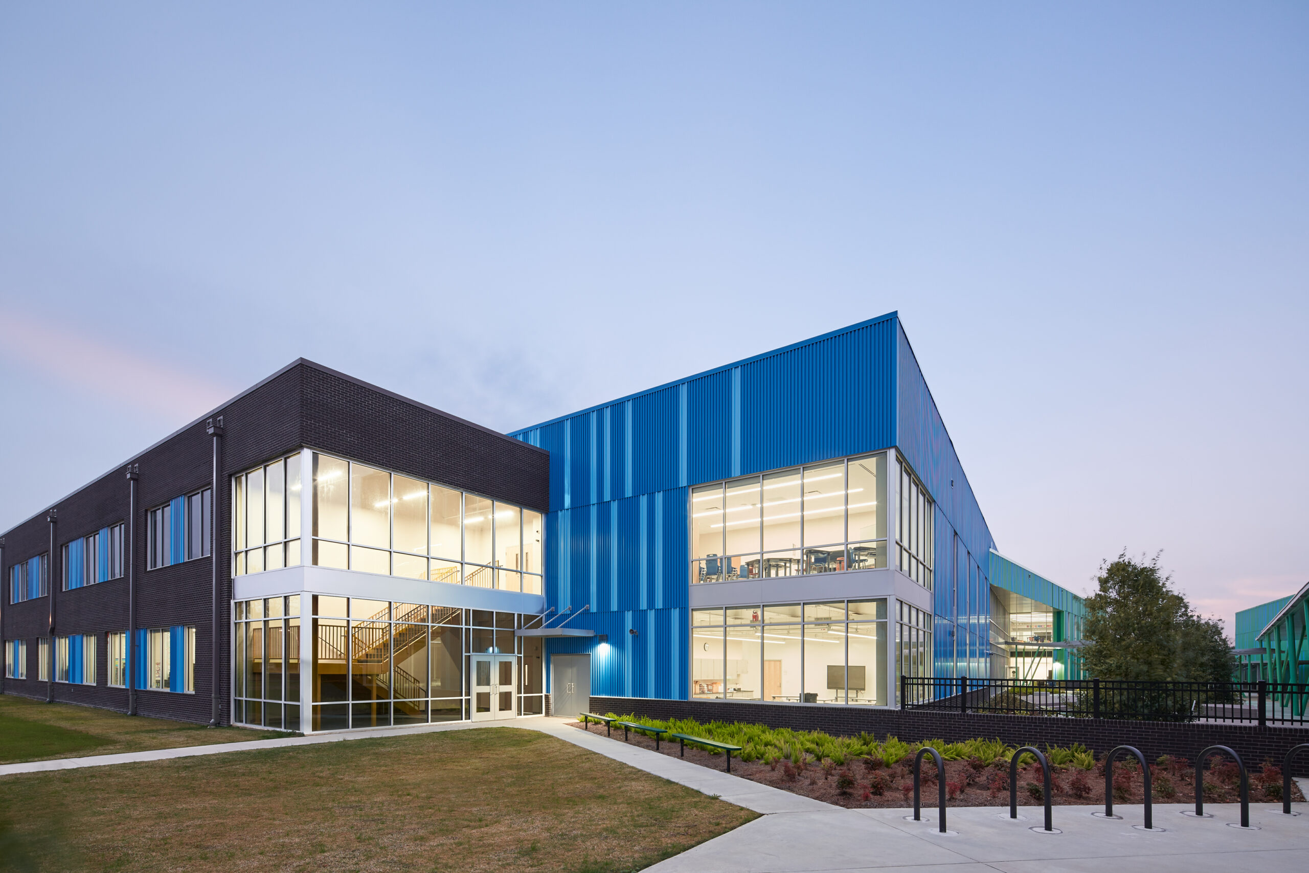 Specialized programmatic spaces including the art room, media center, commons, maker space visually connected to the exterior and interior spaces through large expanses of windows putting learning on display for the community and other students to see.