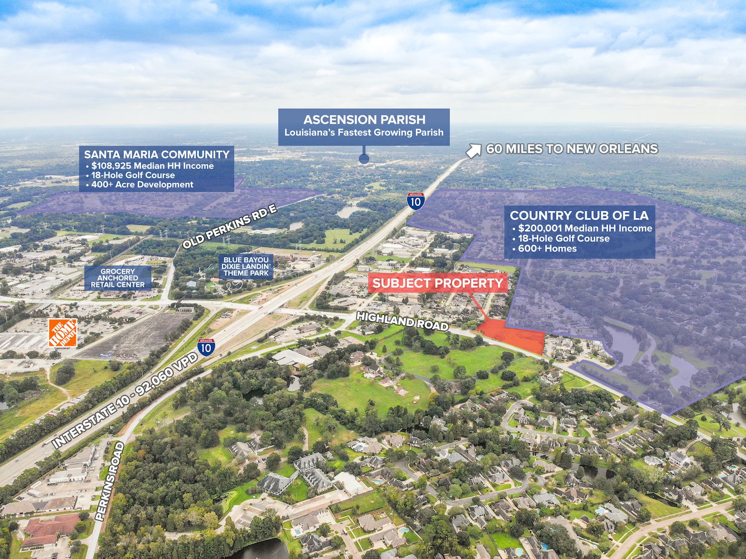 This prominent tract of land is the last undeveloped, commercially zoned property along this stretch of Highland Road. It is less than .3 miles from I-10 which carries 92,060 vehicles per day and sits adjacent to the Country Club of Louisiana. It is about 3.246 acres in size and has approximately 462 feet of frontage on the highly traveled Highland Road. The property is already cleared and ready for development. The residential economic demographics surrounding the property are the strongest in the region and are bolstered by neighborhoods such as CCL, Highland Lakes, and Santa Maria Golf Community. Call George at 225-659-8654. View the listing here.