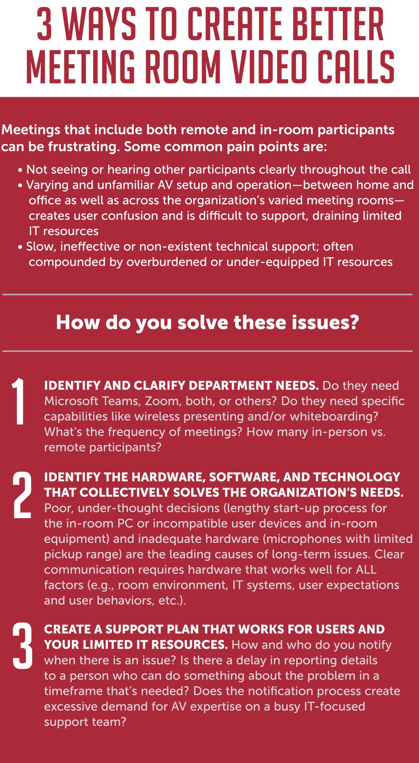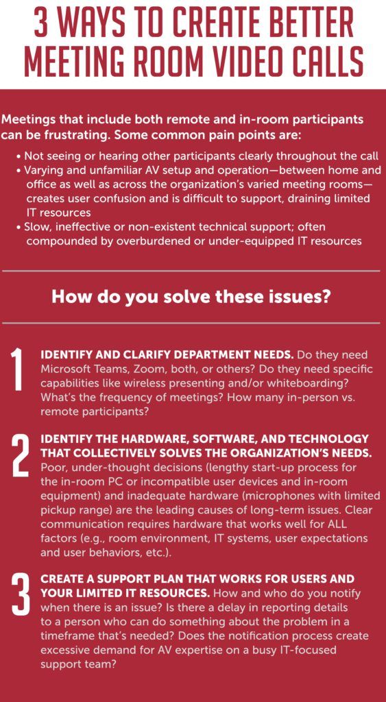 As employees return to the office, they’re finding video calls in meeting rooms more issue-prone than calls they’ve been successfully making from home over the past year. This is particularly challenging for organizations with over eight meeting rooms where workers move between various unfamiliar meeting room configurations.