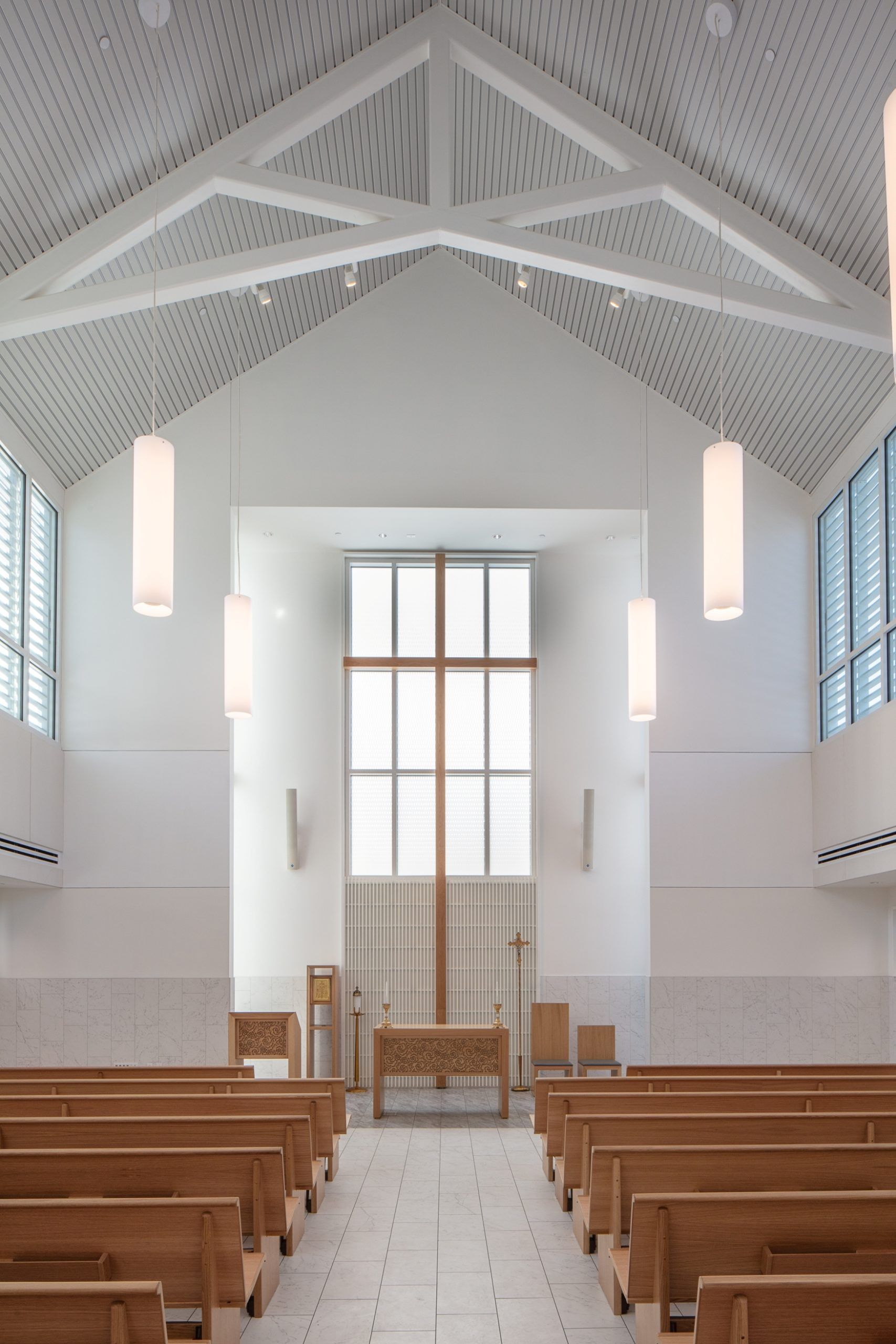 The focal point of the space is the sanctuary, with custom designed wood furnishings and a large wooden cross beyond. The cross is set in a custom fritted glass curtainwall that delicately diffuses light and pulls the eye skyward. Restrained in materials and details, the chapel space—adorned with glass art pieces designed and produced by the students of the school’s art department—provides a peaceful, contemplative environment for the celebration of Mass.