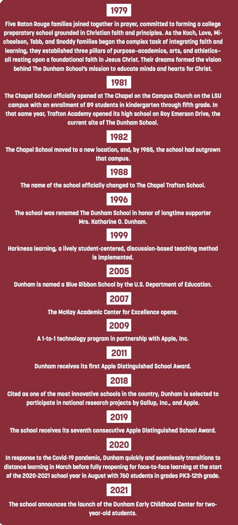 “Today, as we reflect on how far we have come from the small school that first opened in 1981 at The Chapel on the Campus, we are reminded that God’s vision has always been bigger than our dreams. Thanks to the efforts of our administration, board, faculty and staff, the stewardship of our generous donors, nearly 2,000 alumni and the steadfast prayers of many, The Dunham School has become the leading Christian college preparatory school in Baton Rouge, serving approximately 787 students from two-years-old through 12th grade.”